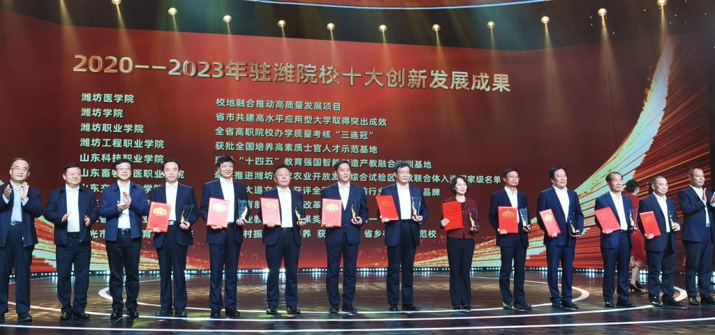 11月8日晚,由潍坊市委宣传部主办,潍坊市广播电视台承办的潍坊市庆祝第 24 个中国记者节主题晚会在潍坊电视台演播大厅举办。晚会现场同时举行“全市优秀记者”“驻潍院校创新发展十大成果” 2 个颁奖仪式,我校获“驻潍院校创新发展十大成果奖”。