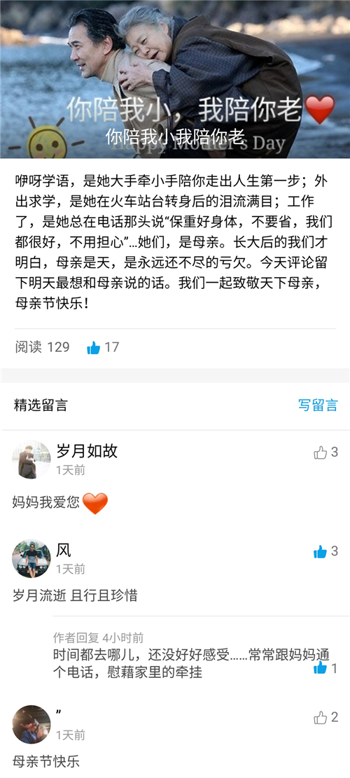 学院大学生新闻中心学生也利用校园QQ公众号开展了《你陪我小,我陪你老》的话题互动活动,表达对母亲的美好祝福。(团委、大学生新闻中心)