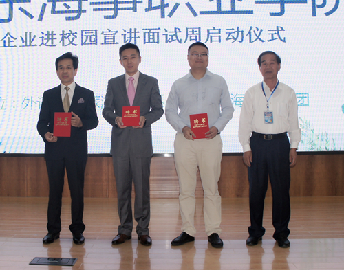 仪式现场,院长王敬良为北京红石新城房地产有限公司酒店公司总经理曹斌先生、潍坊金茂国际大酒店总经理宋宏杰先生、武汉香海船务有限公司总经理包效磊颁发了学院客座教授聘任证书。(旅游管理系)
