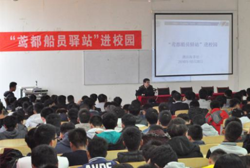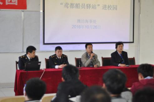 2016年10月26日,潍坊海事处走进山东海事职业学院,在二号教学楼2518会议室开展了“鸢都船员驿站”进校园活动,潍坊海事处政务受理科副科长张德强等领导出席了本次活动,山东海事职业学院航海学院院长吕明、书记臧琪琳陪同参加了这次活动。