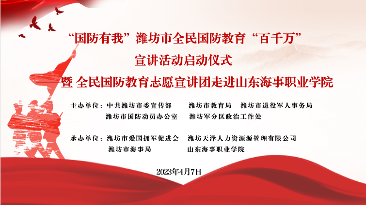 4月7日,“国防有我潍坊市全民国防教育“百千万”宣讲活动启动仪式暨全民国防教育志愿宣讲团走进山东海事职业学院在我校举行。此次活动由潍坊市委宣传部、潍坊市教育局、退役军人事务局、潍坊市国防动员办公室、潍坊军分区政治工作处主办,由潍坊市爱国拥军促进会、潍坊天泽人力资源管理有限公司、潍坊海事局、山东海事职业学院承办。潍坊海事局局长柳强、潍坊军分区政治工作处主任韩富旺、潍坊市新时代文明实践中心主任路全东及市委宣传部、市教育局、市退役军人局、市国防动员办公室、潍坊海事局、潍坊军分区政治工作处和各县市区委宣传部有关领导出席活动。我校400余名师生代表共同参加活动。